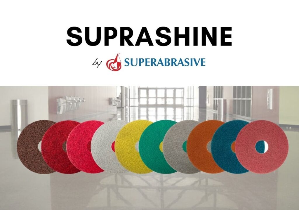 SupraShine pads are diamond-impregnated pads for cleaning, polishing, and maintaining floors, such as concrete, stone, terrazzo, vinyl, epoxy coatings, etc. They can be used with standard floor maintenance machines: auto-scrubbers, buffers, burnishers, and they don’t require chemicals for cleaning and polishing – just the pad + water.