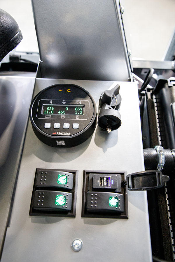 Hydro steering with two control modes reduces fatigue and improves usability; Digital information display provides real-time performance data and diagnostics; Convenience features to improve long-shift usability: Phone holder; USB charging port; Stainless steel cup holder.