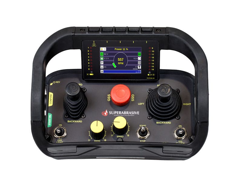 ✓ Controls include: emergency stop, two joysticks to control grinder movement, switches for engine rpm, direction of tool rotation, speed rpm, swing correction